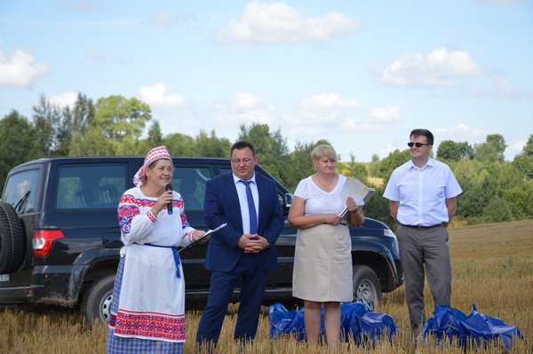Во вторник на поле возле деревни Усвейка УП «Рыдомльский» состоялось чествование передовиков сельхозпредприятия, задействованных в уборке. Пока комбайны выгружали зерно, а артисты автоклуба настраивали аппаратуру, мы ожидали героев жатвы. Ведь повод для встречи был радостный: на утро 9 августа старший комбайнёр Сергей Коголь на комбайне КЗС-1218 первым в хозяйстве намолотил тысячу тонн зерна, а водитель Александр Парахонько первым перевёз две тысячи тонн зерна среди водителей района.