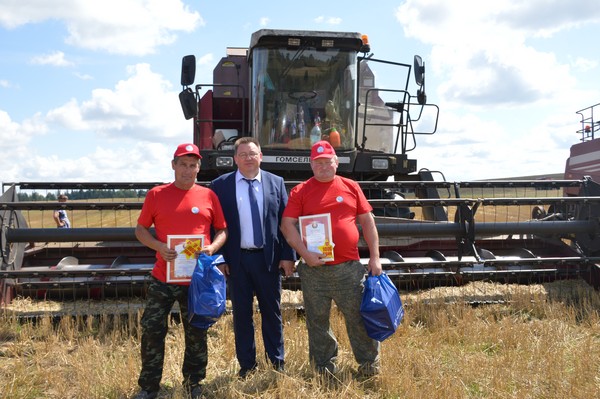 К поздравлениям присоединилась председатель районной организации Белорусского профсоюза работников агропромышленного комплекса Татьяна Пильщикова. Они отметила, что на утро 10 августа в районе среди комбайнёров уже насчитывалось 16 тысячников. Сергей Коголь стал первым среди работников сельхозорганизаций, до него планку в тысячный намолот преодолели только механизаторы крупных предприятий («Белдан» и консервный завод). Здесь же, в УП «Рыдомльский», появился и первый в районе водитель, который перевёз две тысячи тонн зерна. Татьяна Николаевна после искренних слов благодарности вручила им Почётные грамоты, денежные премии и памятные сувениры – бейсболки и майки с логотипом Белорусского профсоюза работников АПК.